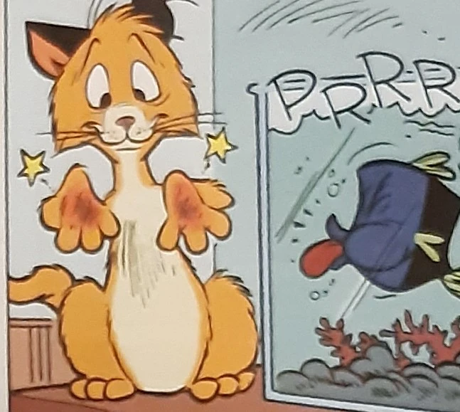 Il felino, irritato, immerge prima l'una e poi l'altra zampa nell'acquario, con il risultato che il pesce le morde entrambe e aggiunge al dolore lo scorno di un altro versaccio.
