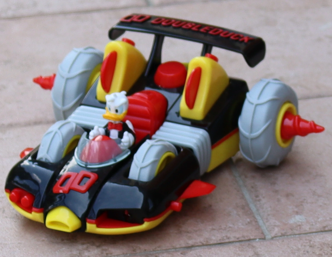 Movimento a retrocarica; spara fari anteriore, dischi degli alettoni, trivelle delle ruote e sedile del guidatore. Dotata di pupazzo di DD. L'auto è riprodotta sulla copertina del n. 2956.