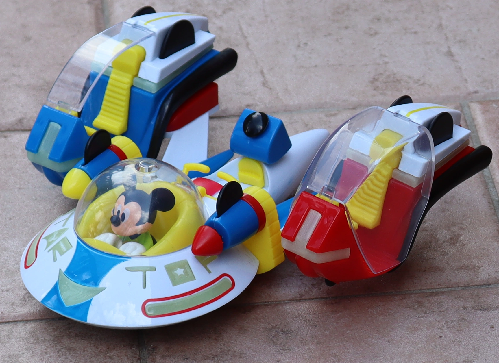 Mezzo spaziale componibile che comprende un pupazzo di Topolino applicabile in ogni postazione, la navicella principale, la sonda e due mezzi laterali trasformabili in moto o aquascooter.