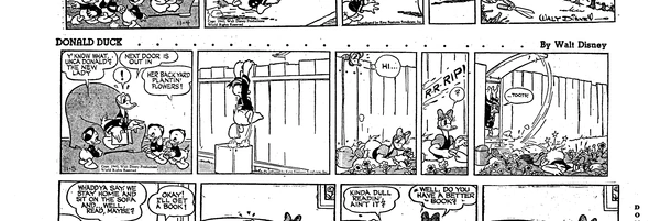 Paperino propone a Paperina di leggere un libro insieme sul divano del salotto. La papera accetta e va a prendere un enorme atlante geografico, che, tenuto da loro due seduti a fianco, li costringe a rimanere distanti. Paperino afferma di trovarlo noioso, e dopo un po' va a prendere un libro tascabile, che permette un contatto molto più stretto.