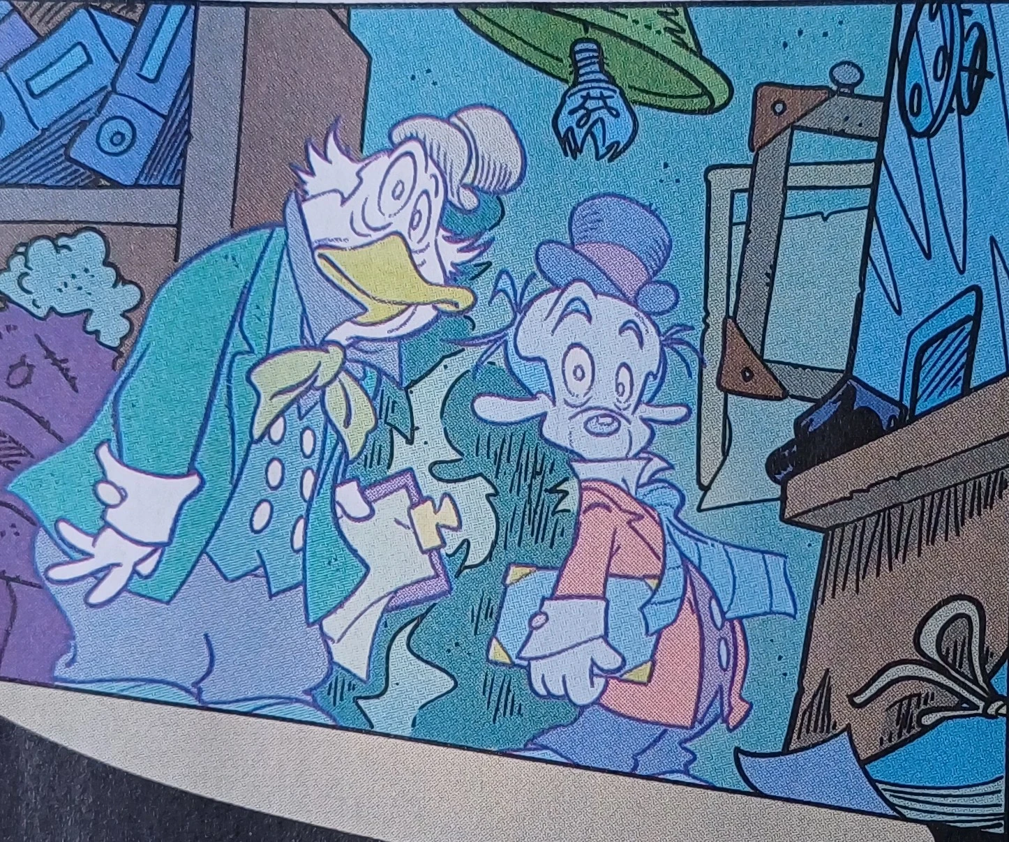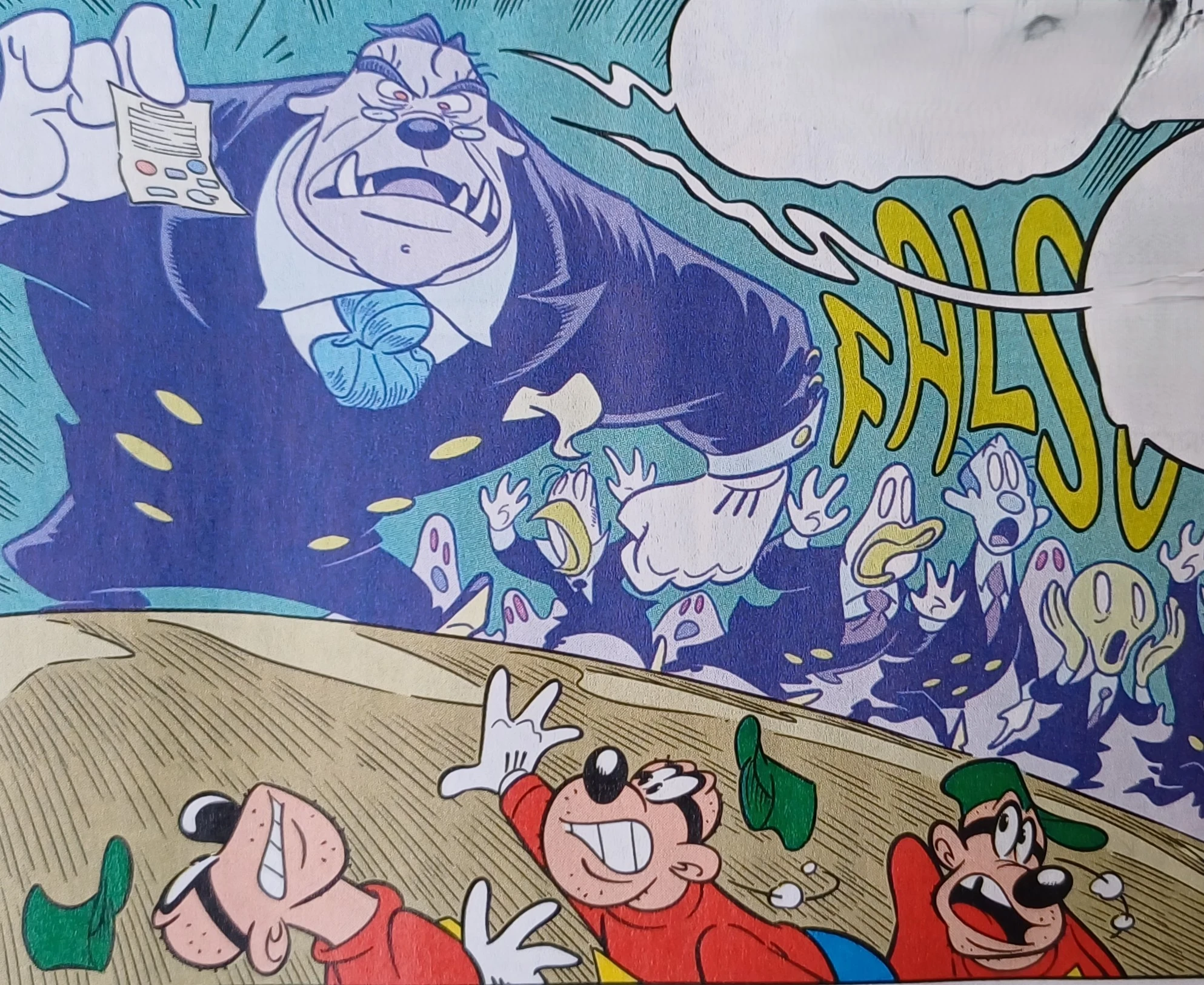 Ma a quel punto risuona potente una voce: FALSOOO! E compare un rabbioso enorme Printmark, con aguzzi denti inferiori, e scatena l'inseguimento ai falsari, che sarebbero perduti se non arrivasse in quel momento un aiuto da fuori (unica possibilità di uscire dal palazzo): Nonno Bassotto sfonda una finestra e rampogna i nipoti che sono scomparsi da un mese! Allora i tre fratelli e Slim si precipitano fuori e col Nonno si danno alla fuga, sempre però inseguiti da Printmark e da altri fantasmi. Slim, che conosce il sottosuolo di Paperopoli, fa scendere tutti in un tombino dove i poteri del dirigente sono nulli. Poi riemergono in una nebbiosa strada periferica, vedono arrivare una macchina della Polizia e si giustificano presso i due agenti spiegando il loro desiderio di una passeggiata nella nebbia. Ma i poliziotti divengono improvvisamente diafani e richiedono con ghigno diabolico il modulo fantasma.