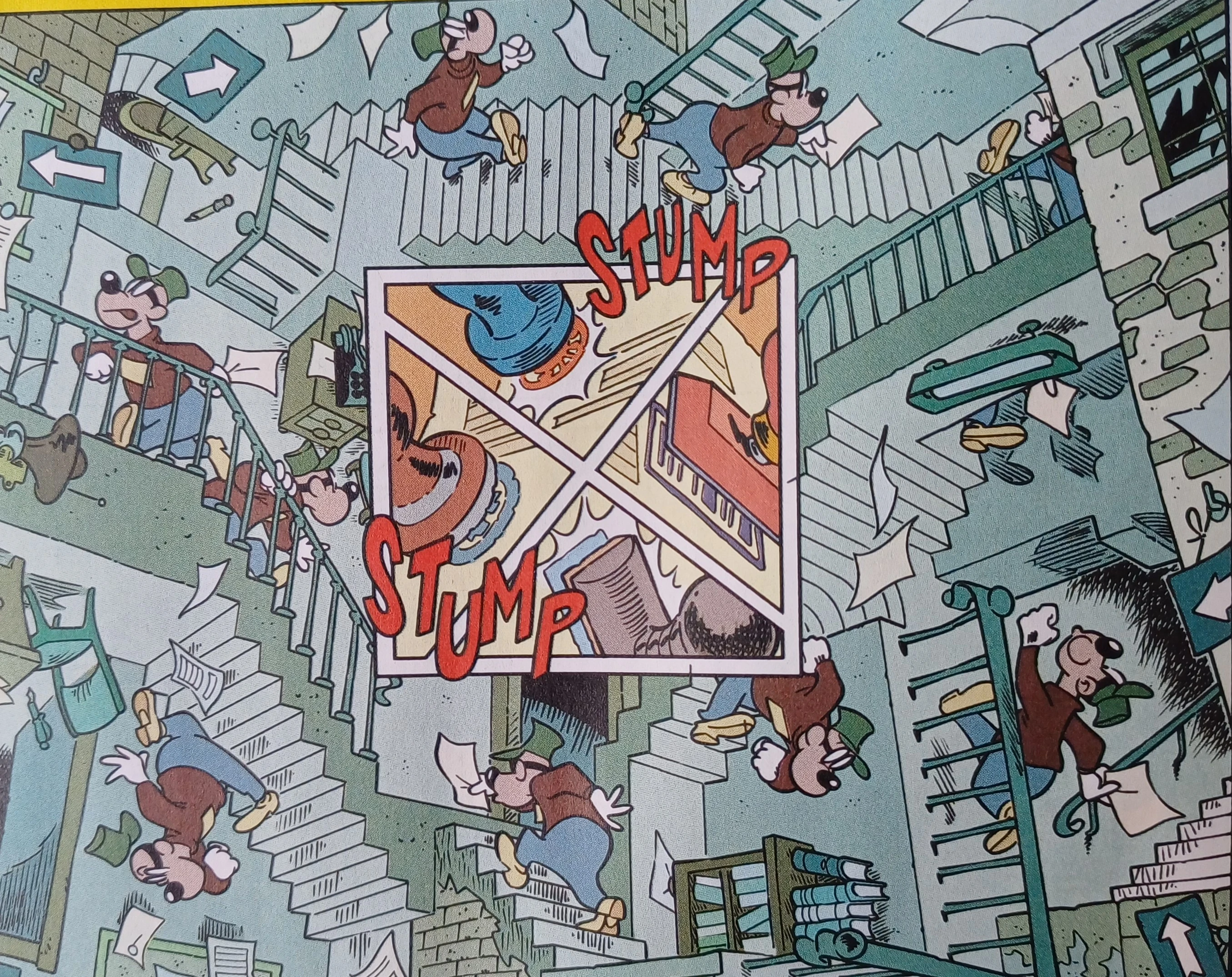 Gualtieri alla sceneggiatura non rinuncia al suo prediletto Universo dei paperi cui solo una volta nella serie di Hatequack ha preferito quello dei topi in Geoffrey e il mistero del mal di luna. Ma, pur facendo parte del loro universo, qui i protagonisti non sono paperi bensì i Bassotti con il Nonno. La storia, divertente e adeguatamente ansiogena, è una ironica rappresentazione delle lungaggini, delle inutili complicazioni e della prepotenza (v. Printmark) burocratiche di cui, in misura maggiore o minore, tutto il mondo sembra soffrire: a tal proposito il «Papersera»[1] cita il fumetto e poi il film «Le 12 fatiche di Asterix»[2] in cui anche i Galli sono alle prese con la farragine della burocrazia. In entrambe le storie c'è un rimando grafico alla notissima litografia Relatività (1953) di Mauritz Escher, con le scale impossibili che si intersecano e si dividono senza che se ne possa individuare l'origine e la direzione. All'interno di questo marasma i Bassotti si muovono con la consueta goffaggine, risolta poi dal più avveduto Nonno. E anche in questo caso il finale resta in sospeso, mentre arriva un Hatequack, al solito contemporaneamente narratore e partecipe della storia, dipinto nelle tinte verde pallido dei fantasmi (onore ai disegni di Limido!).