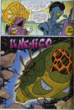 La vicenda consente a Topolino di rinnovare i rapporti col suo vecchio amico Pippo, nel frattempo divenuto comandante dell’astronave Planet Explorer 2, che si assume l’incarico di riportare il profugo al suo pianeta. Pippo ha però anche una notizia inquietante da comunicare: alla Frontiera, è in corso la guerra contro un’oscura entità chiamata Il Nemico.