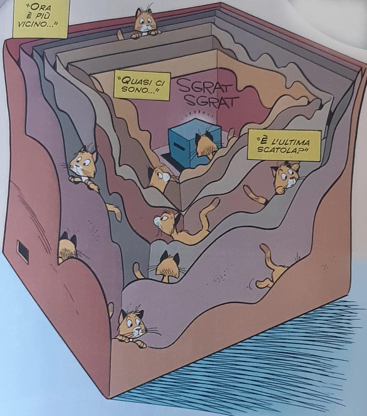 Il gatto parte in esplorazione e, infilatosi nella scatola, si accorge che la prima ne contiene una seconda e così via.