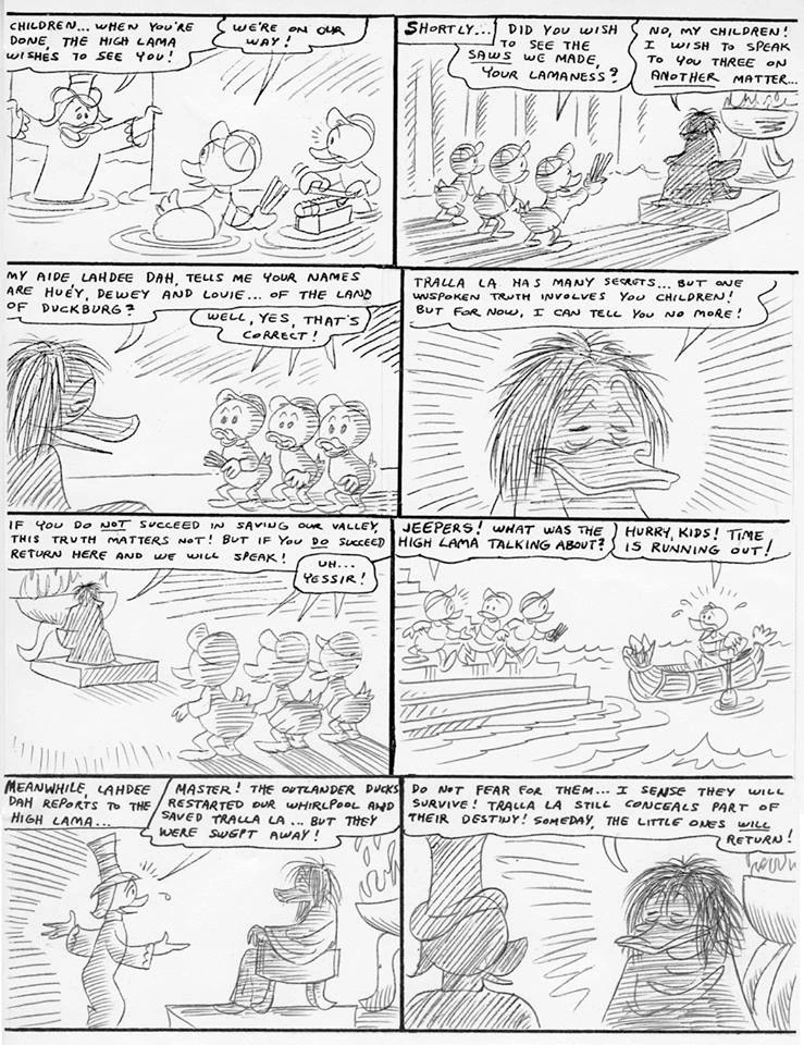 Don Rosa lascia ogni libera interpretazione. Nella pagina vediamo il Grande Lama che compare ad Xanadu ha fatto chiamare Qui, Quo e Qua nella sua stanza per parlargli di una verità molto importante che lì riguarda, purtroppo non può riferirla subito perché, essendo Xanadu allagata, devono prima salvare la valle e poi dovranno tornare da lui per farsi dire questa verità. Successivamente un monaco riferisce al Lama che i paperi sono riusciti a salvare Tralla La ma se ne sono immediatamente andati. A questo punto il Lama dice di non avere paura, che sa che sopravvivranno e che Tralla La fa ancora parte del loro destino e un giorno torneranno.