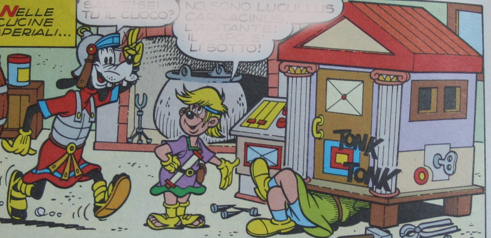 Pippo offre il suo aiuto e il cugino lo porta nelle cucine, poi si allontana. Pippo trova un ragazzino, Lucullus Carnacinus, aiutante del cuoco e impegnato ad assisterlo mentre, sdraiato sotto una sorta di casupola, sta realizzando un nuovo modello di forno; del cuoco compaiono solo le scarpe, un paio di mocassini che poco hanno a che fare con i sandali romani, ma in questo il personaggio moderno non vede alcuna stranezza.