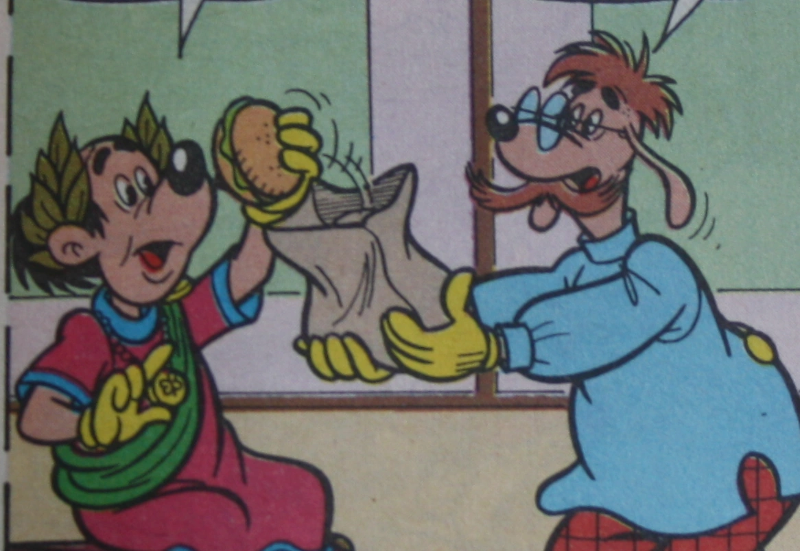 L'aiutante dà a Pippo la lista degli ingredienti di una ricetta nuovissima di nome Amburgus; fingendo di cercare tali ingredienti, il nostro si aggira per il palazzo sempre in cerca di Marlin, ma finisce nella gabbia dei leoni, da cui viene brutalmente allontanato dal domatore, e si imbatte persino nell'imperatore che sta dando udienza a due centurioni, Flavius Carmenrus e Brutus Auditorium. Cacciato anche dal princeps, viene portato di peso da due guardie pretoriane al circolo ufficiali, dove Caio Pippus sta tessendo le lodi del cugino. Saputo che Pippo ha «infastidito» i leoni e disturbato senatori e imperatore, senza tuttavia aver trovato gli ingredienti richiesti, Pippus decide di accompagnarlo nella ricerca. Giungono all' Emporium Armanus, una macelleria, e Pippo chiede carne macinata, stupendosi che il negoziante sia costretto a tagliuzzarla a mano e non usi il tritatutto. Arrivano poi dai fructuarii, che però ignorano cosa sia una patata. Pippo, esasperato e affamato, chiede dove sia un Fast Food, suscitando lo stupore del cugino; ma finalmente si fa strada nella sua testa la verità. Lascia Pippus, dicendogli di mettere la carne in frigorifero, e torna a palazzo a cercare il cuoco, che è Marlin.