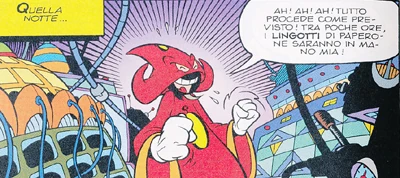 Nella sua prima apparizione riesce a rapire e a trasportare in uno spazio intradimensionale il miliardario Paperon de' Paperoni, chiedendo per il suo rilascio una cifra esorbitante di dollari in lingotti d'oro. I suoi piani verranno sventati da Paperinik.
