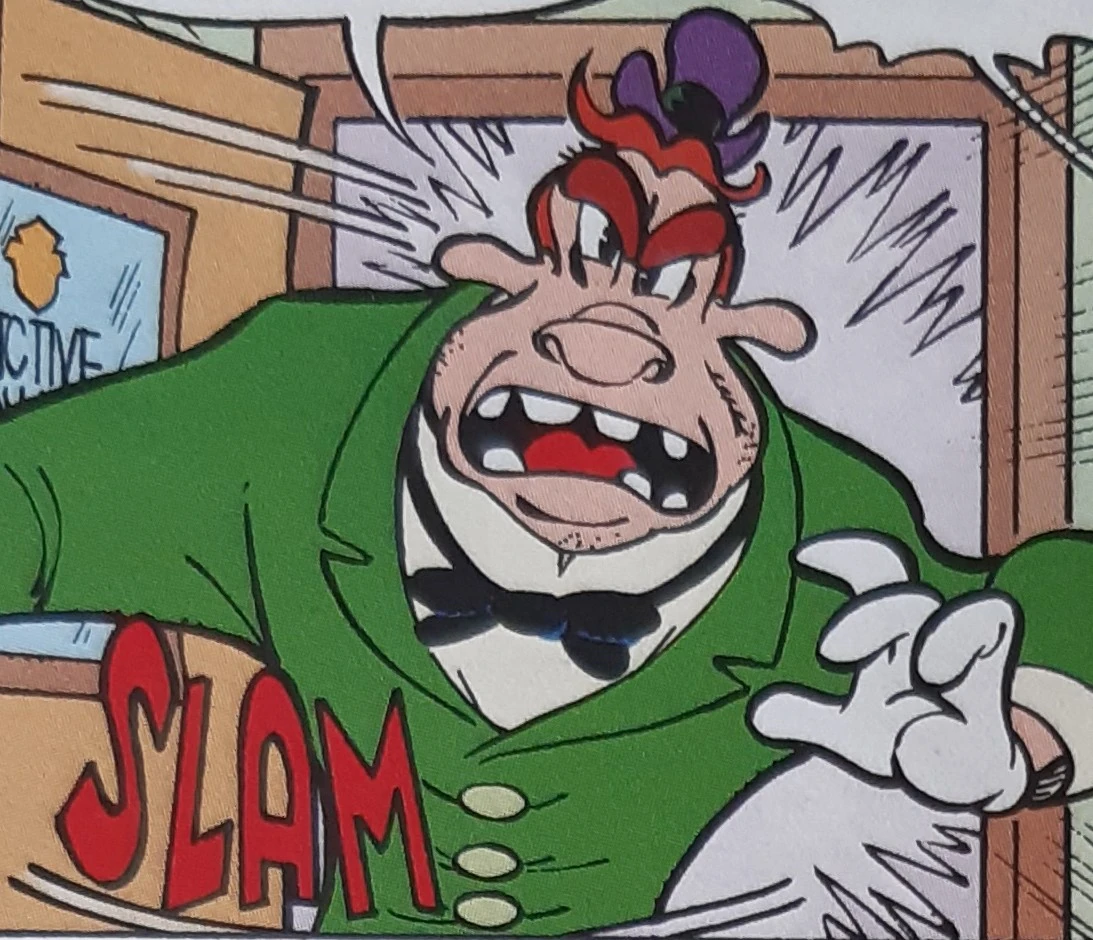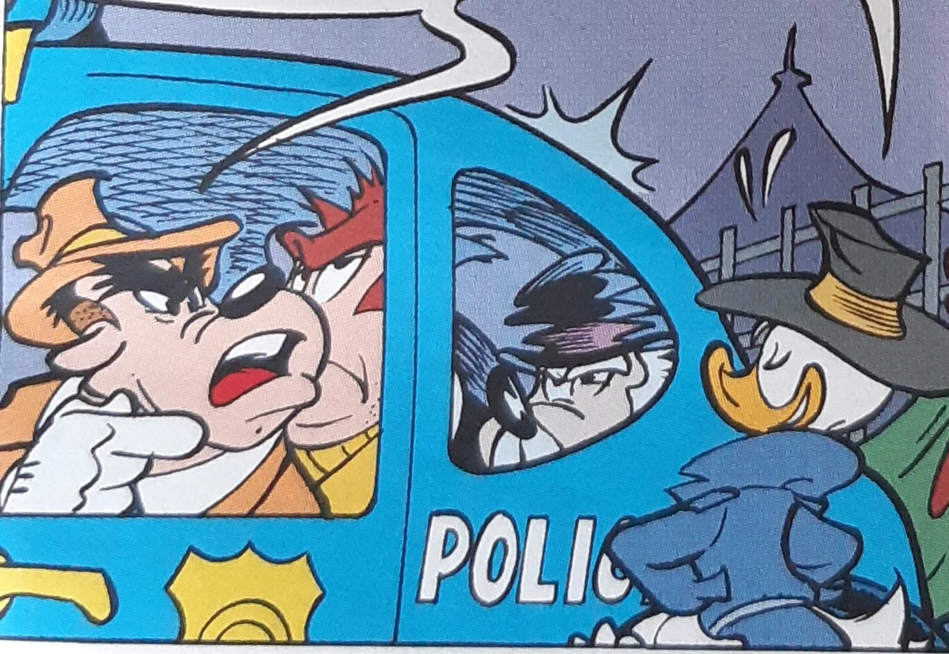 Il Detective Donald Raymond Duck sta aspettando che la sua assistente Oletta torni col pranzo dal chiosco di Wilbur e, per ingannare l'attesa, costruisce un castello di carte; ad un tratto risuona un imperioso battere alla porta e si presenta un omaccione da cipiglio aggressivo. Donald caccia un urlo, ma non per lo spavento, bensì perché lo spostamento d'aria della porta ha fatto crollare il castello. Arriva Olettta e urla anche lei perché ha scordato le patatine. L'omone è deluso: sperava di aver impaurito qualcuno col suo aspetto da «losco figuro», ma il detective gli dice che non somiglia certo a un lestofante.