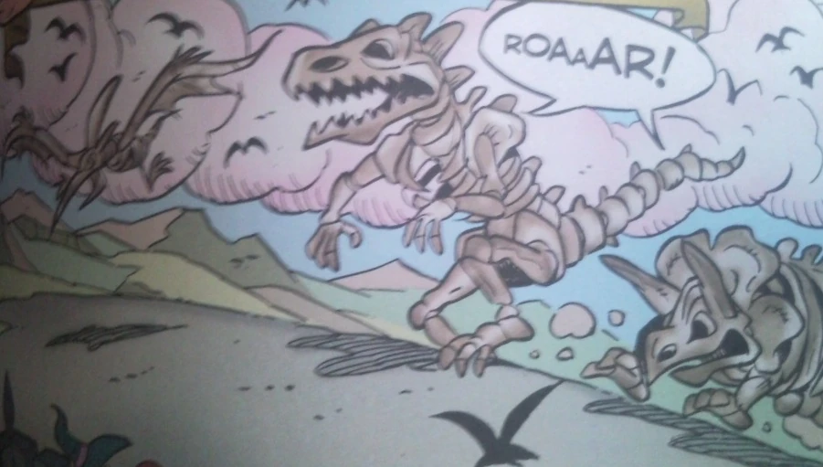 Nella storia vengono raffigurate le classiche specie come i T Rex, gli Pterodattili, i triceratopi e mostruose creature marine dei tempi dotate di grossi scheletri robusti e possenti denti.