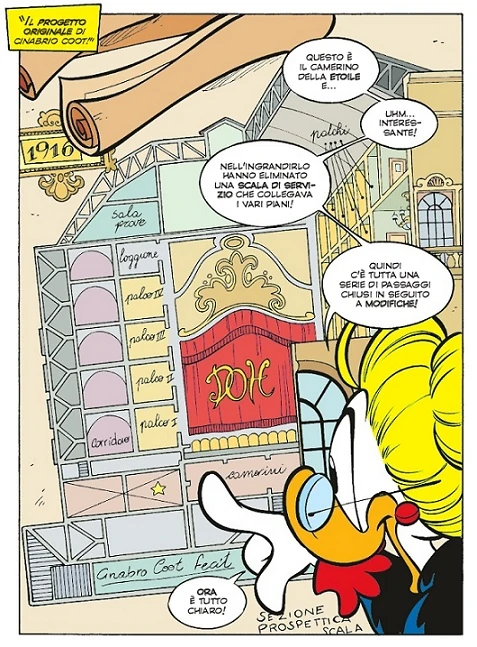 Secondo la rubrica TopoTravel e la storia Nonna Papera e il fantasma dell’opera, realizzate da Blasco Pisapia, l'edificio venne realizzato e progettato da Cinabro Coot lo zio di Nonna Papera all'inizo del XX secolo[2].