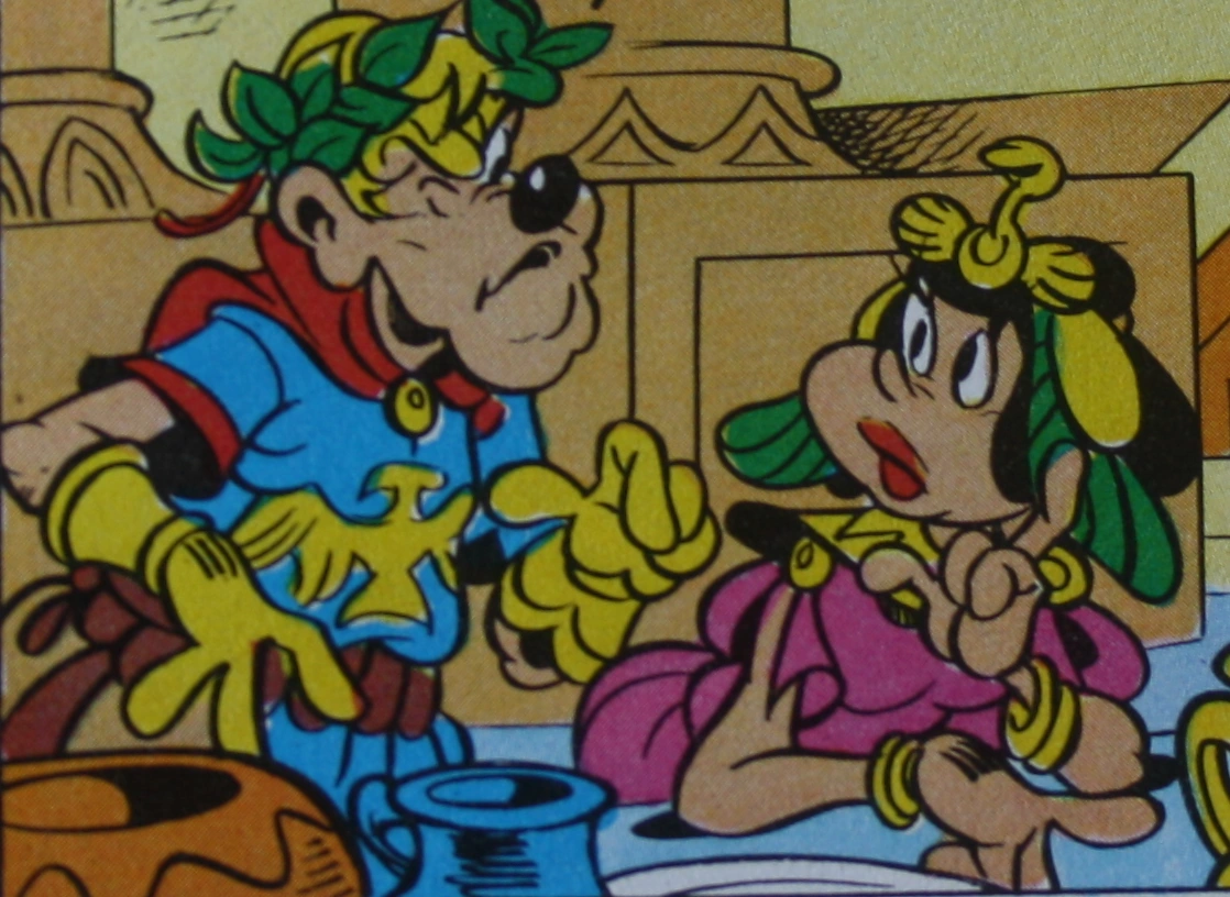 Topolino e Pippo sono al Museo di Storia e Archeologia di Topolinia per accogliere Zapotec, in procinto di tornare da un viaggio nell'antico Egitto. Marlin è assente e ha lasciato a Topolino istruzioni per azionare la macchina e far rientrare Zapotec ma, quando il portello si apre, compare solo un papiro in caratteri geroglifici con alcuni disegni che riproducono la sagoma delle orecchie di Topolino, sorta di indicazione del destinatario, e una banconota da un dollaro. A un primo esame, Topolino decifra il nome di Cleopatra, ma tocca a Marlin dare più precisi chiarimenti: Zapotec è partito per visitare l'antica Biblioteca di Alessandria e consultarne i testi prima della loro distruzione. Ma il papiro è un'incognita anche per Marlin, poiché sembra che il redattore del testo abbia usato i geroglifici adattandoli al linguaggio moderno. Topolino e Pippo quindi partono per l'Egitto dell'anno 47 a.C. a cercare Zapotec. Atterrano sulla cima di un obelisco nel pieno di una manifestazione di protesta del popolo affamato contro la regina, ma all'apparire delle guardie del visir tutti si dileguano. Un fuggiasco dice loro che il raccolto è stato abbondante, ma il grano è sparito non si sa dove.