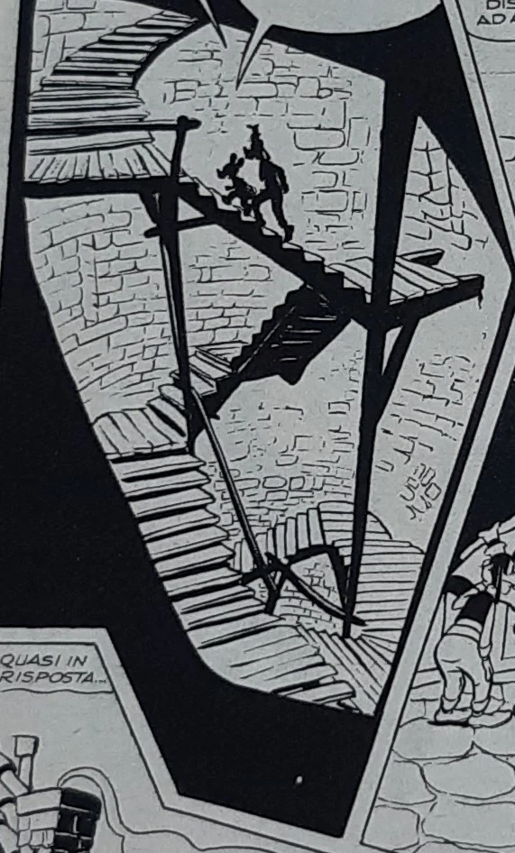 Topolino tenta con lo spadone di Pippo di divellere la grata per poi cercare la fuga attraverso il canale sotterraneo dal quale arriva l'acqua; riesce nell'impresa, i due si tuffano e riemergono stremati presso la riva del lago, nel punto dove Pippo ha battuto la testa, in corrispondenza del solido condotto sotterraneo.