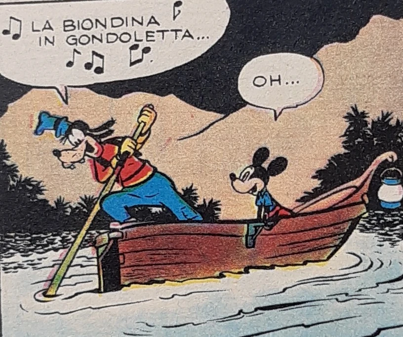 Giunti al piccolo lago davanti al castello, devono attraversarlo in barca; Pippo è ai remi, ma uno di essi si spezza e l'improvvisato nocchiero deve procedere con un remo solo, come in gondola; riesce a raggiungere la sponda, ma il remo si conficca nel fondale e Pippo vi rimane appeso. Topolino accorrre a salvarlo, ma non può evitare tuttavia che il malcapitato si bagni completamente e si prenda pure una testata sul fondo del lago, contro qualcosa di molto duro.