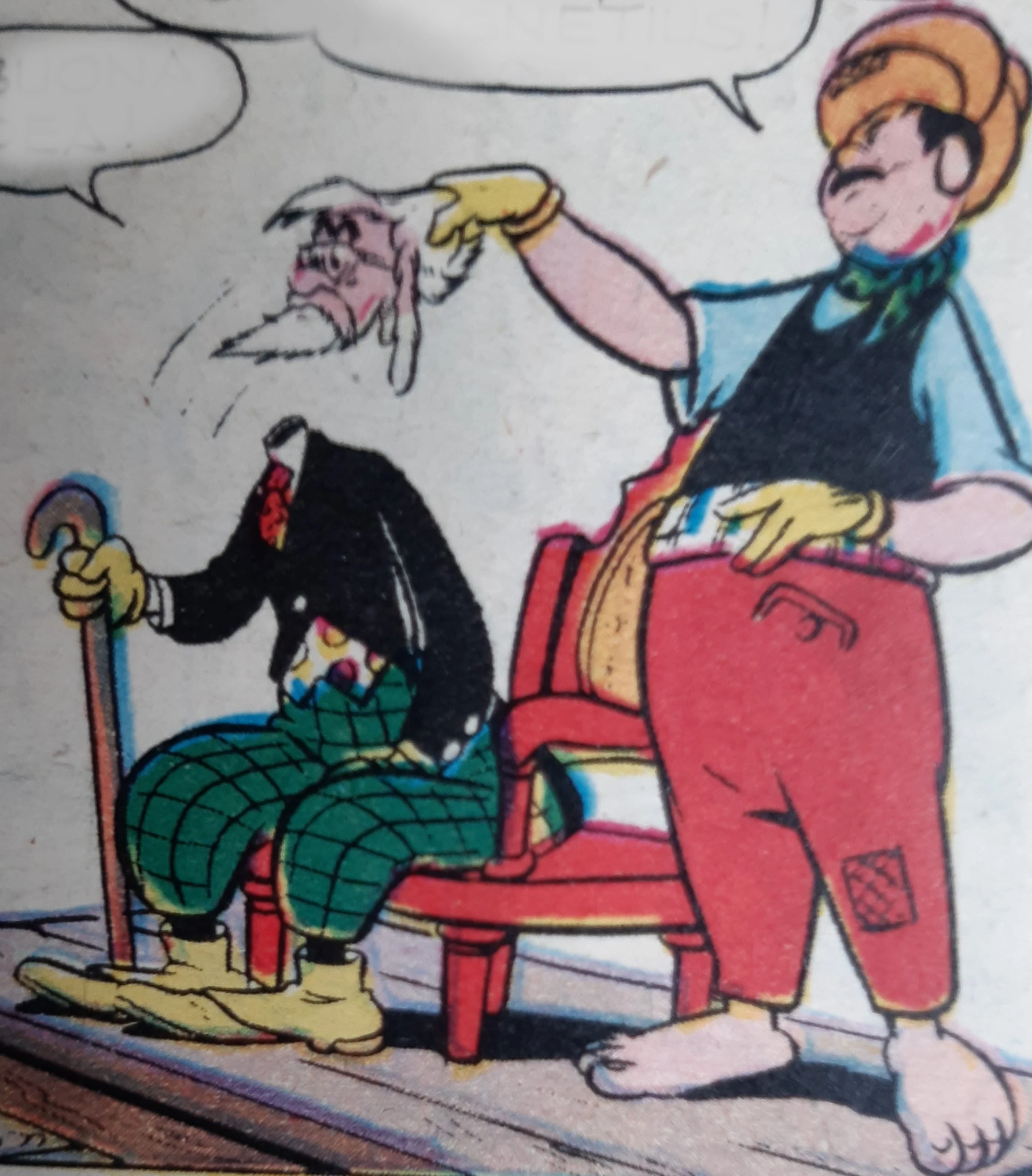 Topolino però è già dentro e i due stanno per confrontarsi quando improvvisamente le luci si spengono e compare un fantasma avvolto in un lenzuolo bianco, che parla in rima e odora di muffa, poi vola minaccioso verso i nuovi arrivati con una lanterna accesa. Pippo è terrorizzato, ma Topolino no: afferra la lancia di una delle armature per difendersi, viene salutato dal solito pupazzo e si scontra con un altro fantasma armato di spadone, fantasma che risulta però essere Pippo: finito dietro una parete girevole, è stato ricoperto con un lenzuolo e preso a calci da qualcuno. Il mistero si infittisce ed arriva pure, accompagnato da scoppiettii e suoni di trombette, un altro fantasma armato di padelle. I due fuggono su per una scala i cui gradini però si chiudono a formare uno scivolo e portano Topolino e Pippo al cospetto di un uomo anziano, seduto su una specie di trono; al suo fianco c'è Kalimur, un energumeno con in capo un turbante e dall'aria pericolosa.